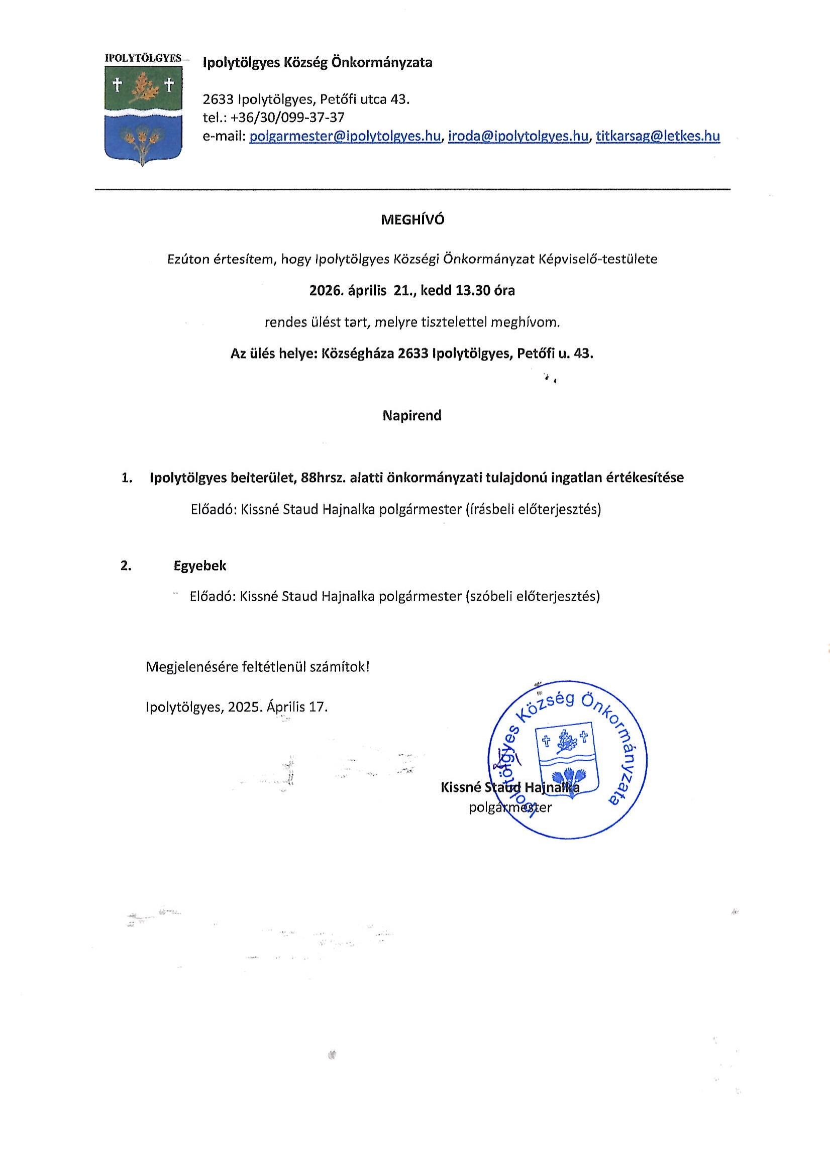 Meghívó – Képviselő-testületi ülés